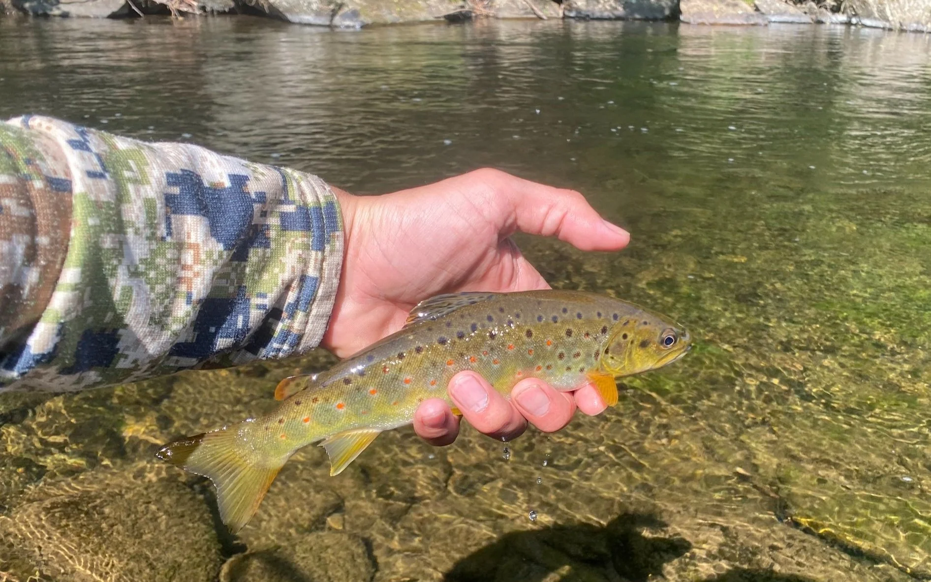 Once the casting came together, we started working the transition from the cast to the drift so that he was in contact a little earlier. We continued hiking along the stream and he was able to pick up a few more fish and was getting the hang of things. At that point I cut him loose and we both continued to fish the rest of the morning. Most of the first were caught on bwo and sulphur emerger patterns tied on a tag. We switched between small pheasant tails, frenchies, and perdigons on the point.